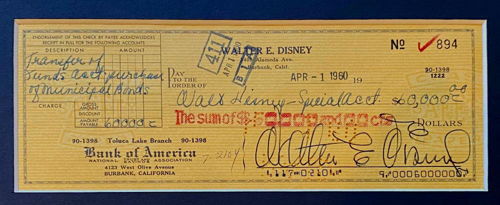 Disney signed check was offered in Disneyland's Disney Gallery this year for $22,000!