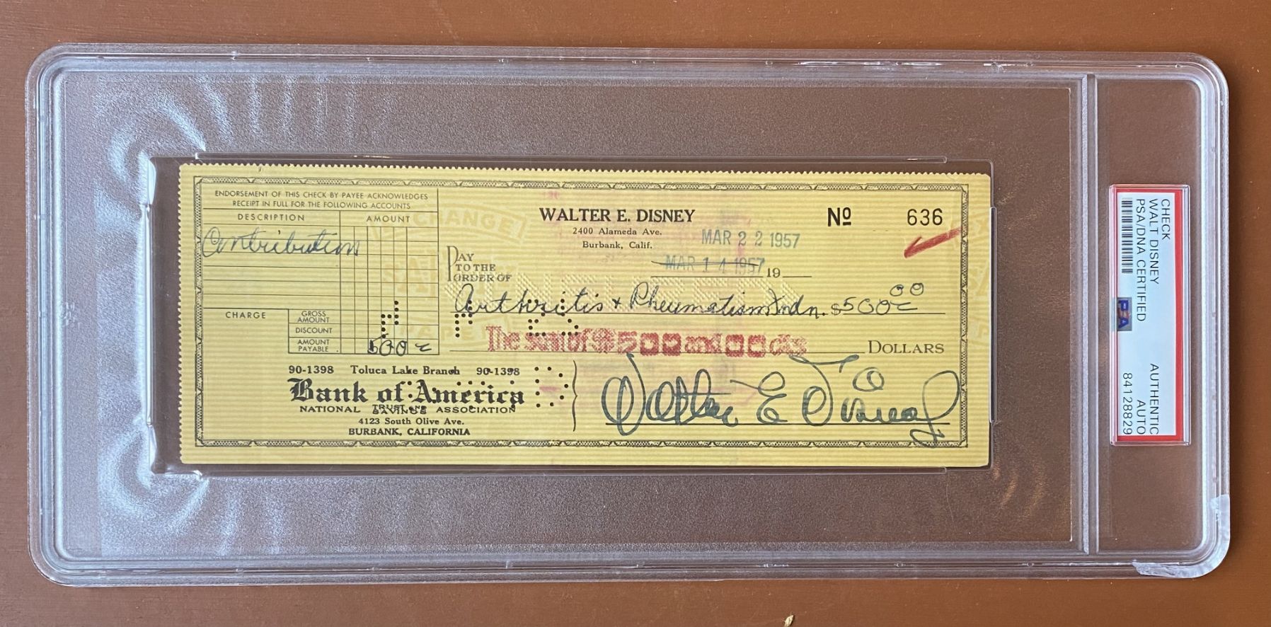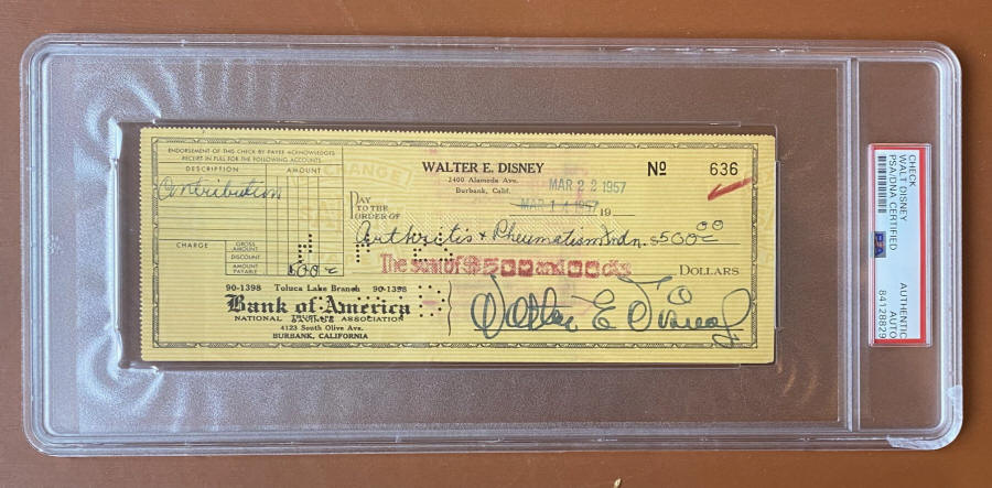 autograph has been authenticated and encapsulated by PSA/DNA and includes thei Collectors love signed checks for a number of reasons; indisputable authenticity (complete with the original bank stamps) and Disney's full legal Walter E. Disney signature. Even if not signed a Walt Disney check would be a collector's item- printed with Walt Disney's name, business address (the Disney studio address), and direct from Walt's checkbook! But Walt Disney has personally signed this 1957 bank check with a bold black fountain pen ink signature. The check is from his personal account at a