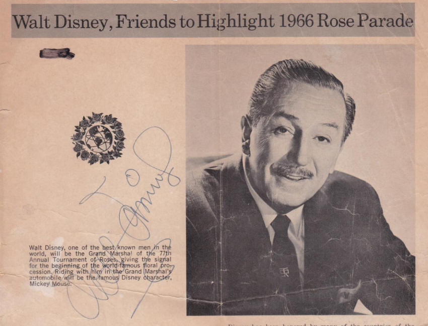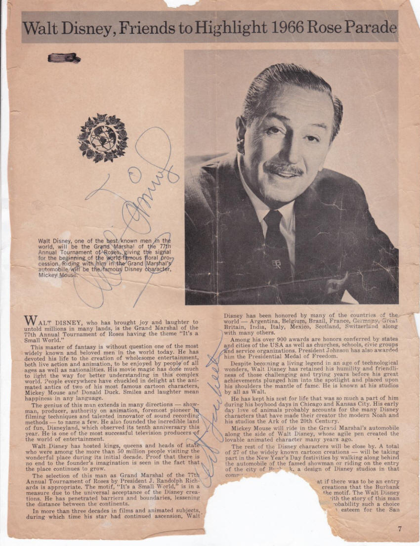 Rose Bowl Program Page The theme of "It's a Small World" was appropriate when Walt Disney was chosen as Grand Marshal of the 1966 Pasadena Rose Parade. I always tell Disney collectors that an autograph is so much more enjoyable when the history of how it was obtained has been preserved. Included with this wonderful pair of autographs of Walt Disney and Art Linkletter is an email from the original recipient: