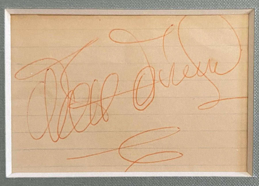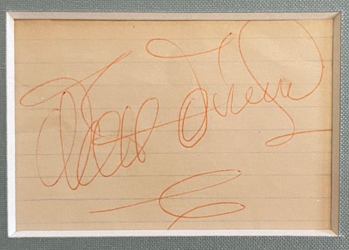 Signed sheet measures approximately 3" x 2". Ready to hang; frame measures