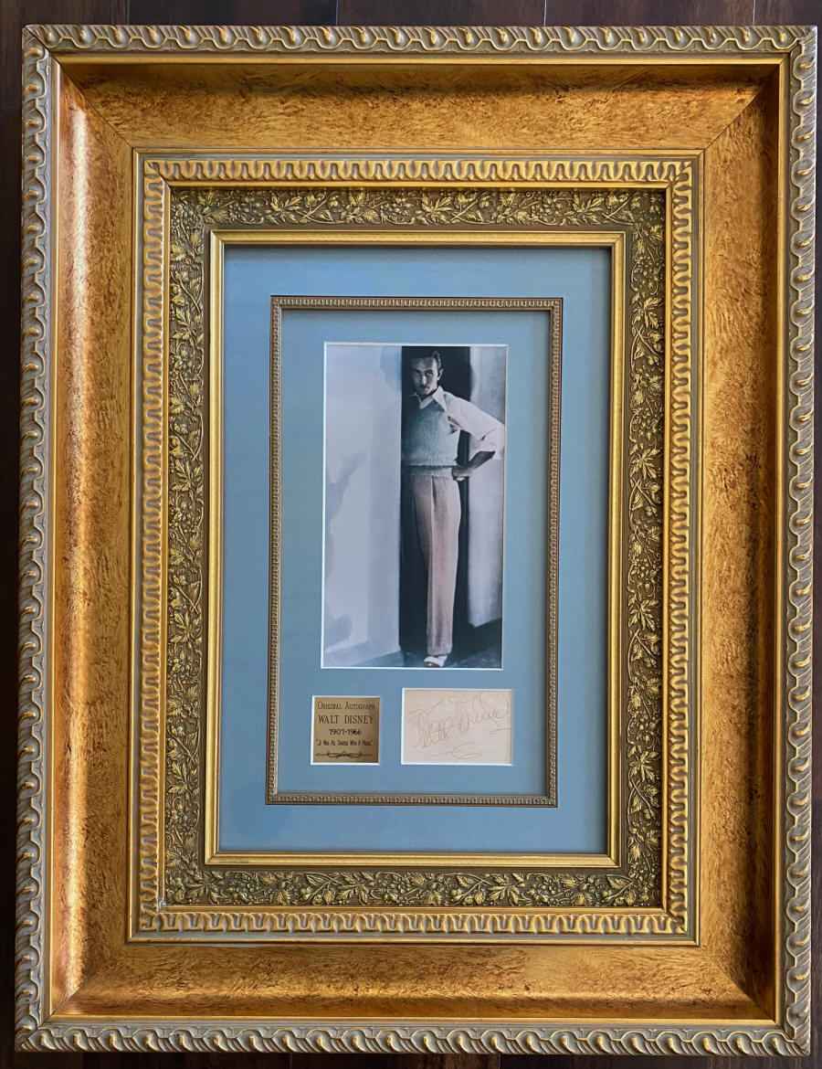 Walt Disney's autograph in red ink, purchased from Walt Disney World, elaborately framed. A beautiful display piece, and double authenticated! An engraved plaque reads: Original